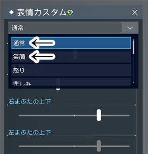 - 表情カスタム「通常」欄の項目「目じりの上下」「右(左)まぶたの上下」