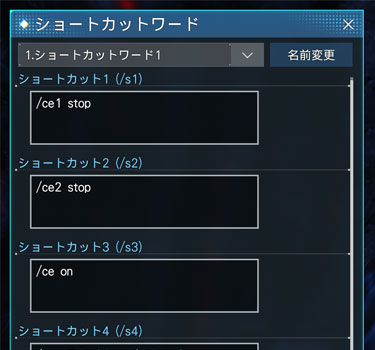 - ショートカット1(/s1) →「/ce1 stop」(表情を通常顔に+視線固定)
