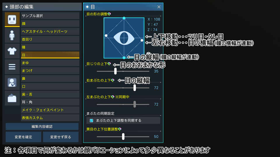 - 「「目の形の調整」の左右の白点」の左右移動 …… 目の横幅(瞳の横幅が連動)