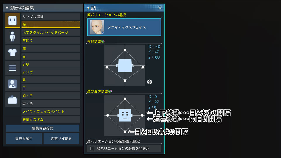 なお、以下はアニマティカフェイスとアニマティクスフェイスのキャラを前提としています。それ以前の顔バリエーションについては調整項目の有無や調整項目によって変化する内容などが異なりますのでご注意下さい。