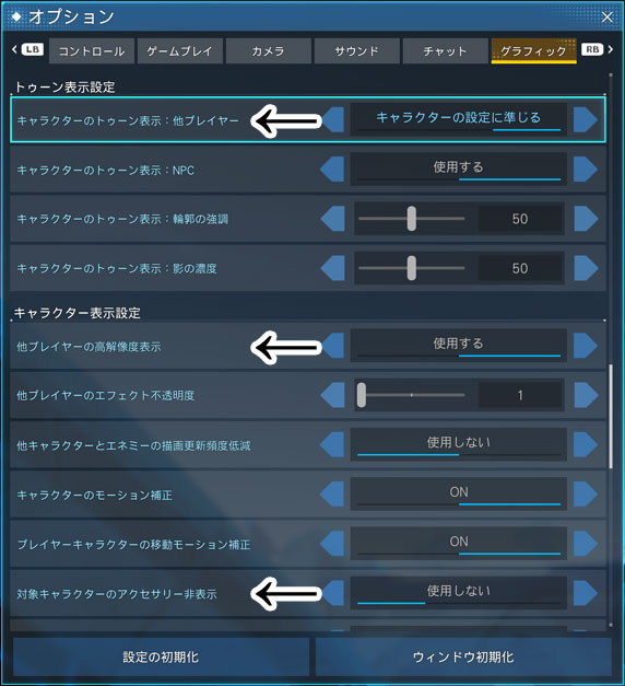 - トゥーン表示設定 → キャラクターのトゥーン表示:他プレイヤー …… キャラクターの設定に準じる