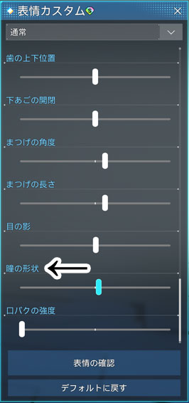 この2つは連動しているので、「目」の方でこれらを変更すると、表情カスタム「通常」の方も変わってしまいます。